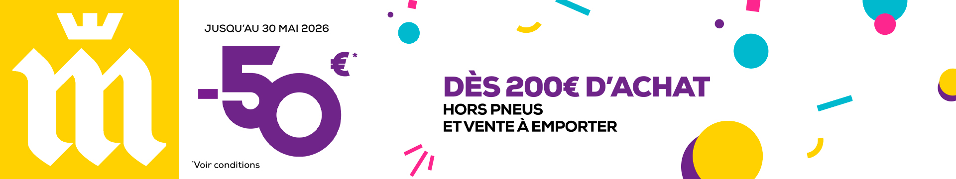 A l'occasion de nos 50 ans, nous vous offrons 50€* de remise dès 200€ d'achat sur de nombreuses prestations et pièces.