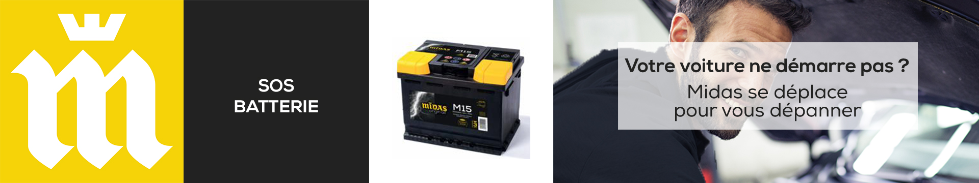 * Déplacement rapide après réception de la demande par un technicien d’un centre Midas participant, dans un rayon de 15 km autour du centre Midas concerné, accessible en moins de 15 min en voiture. L’intervention de dépannage n’est pas réalisable sur les voies de circulation. Elle ne pourra se faire qu’à domicile ou dans un parking public. La demande doit être faite par téléphone entre 8h30 et 16h durant les jours d’ouverture du réseau Midas. En cas d’horaires d’ouvertures spécifiques du centre Midas, ce sont ces derniers qui s’appliquent. Le dépannage consiste en un test de la batterie et une remise en route du véhicule par booster ou câbles de démarrage en cas de batterie usée. Si le redémarrage par booster ou câbles n’est techniquement pas possible, alors le déplacement reste dû par le client. A la suite du dépannage (redémarrage moteur), le client est invité à se rendre directement avec son véhicule dans le centre Midas pour un diagnostic complet et une éventuelle réparation (prestations non incluses dans le prix de 29€ TTC). Service indépendant de la garantie batterie.